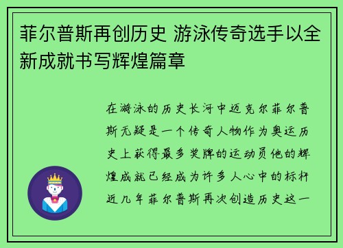 在游泳的历史长河中,迈克尔·菲尔普斯无疑...