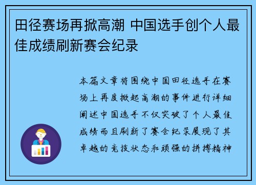 本篇文章将围绕中国田径选手在赛场上再度掀...