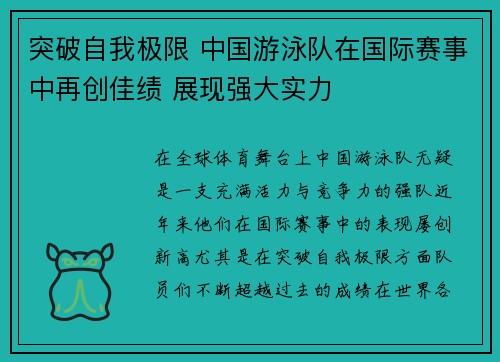 在全球体育舞台上,中国游泳队无疑是一支充...