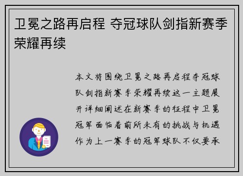 本文将围绕“卫冕之路再启程 夺冠球队剑指...