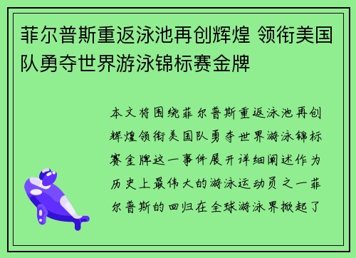 本文将围绕菲尔普斯重返泳池再创辉煌,领衔...