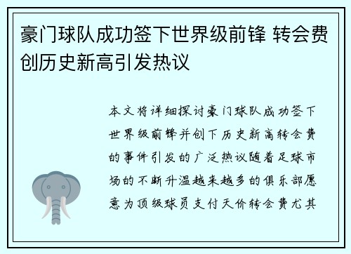 本文将详细探讨豪门球队成功签下世界级前锋...