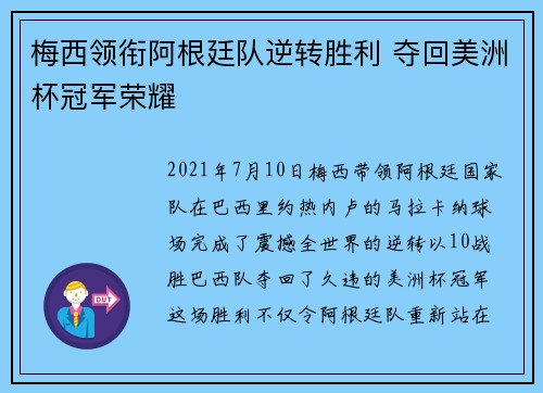 2021年7月10日,梅西带领阿根廷国家...