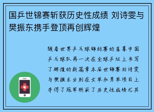随着世界乒乓球锦标赛的落幕,中国乒乓球队...