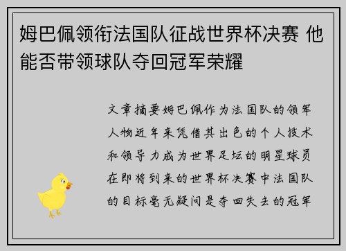 文章摘要:姆巴佩作为法国队的领军人物,近...