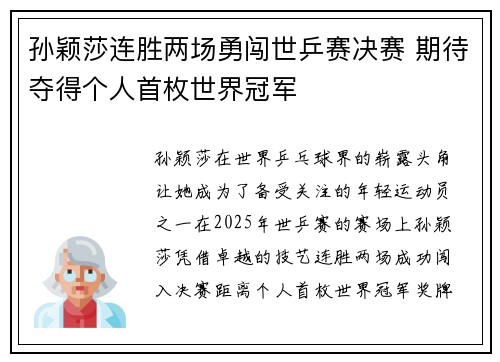 孙颖莎,在世界乒乓球界的崭露头角,让她成...