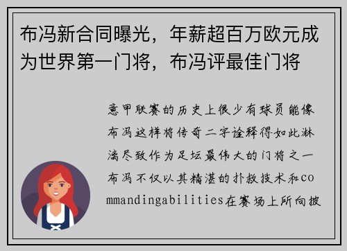 意甲联赛的历史上,很少有球员能像布冯这样...